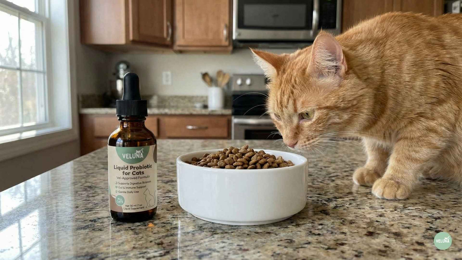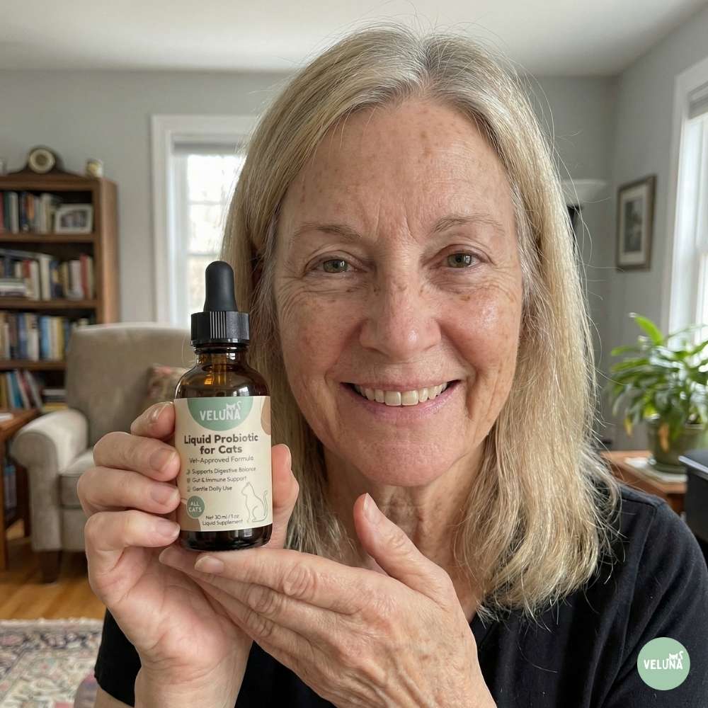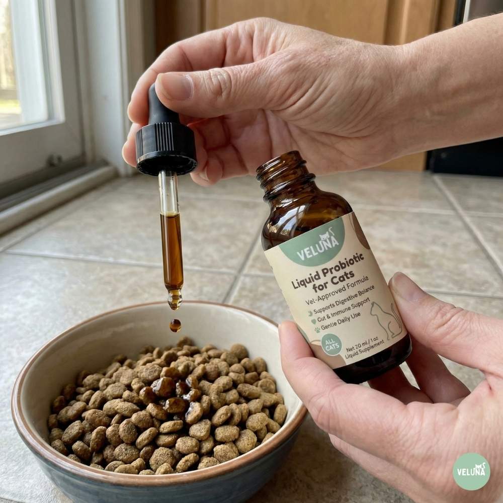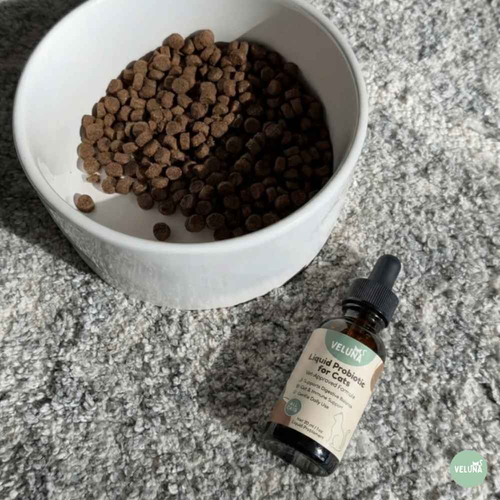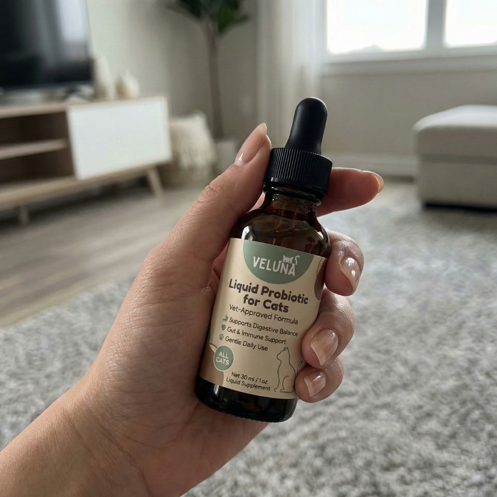 Veluna Υγρό Προηγμένο Προβιοτικό για Γάτες – μια καθημερινή λύση σχεδιασμένη να υποστηρίζει τη γάτα σας απέναντι στο υπερβολικό γλείψιμο, το ευαίσθητο δέρμα και τα ερεθισμένα φαλακρά σημεία.