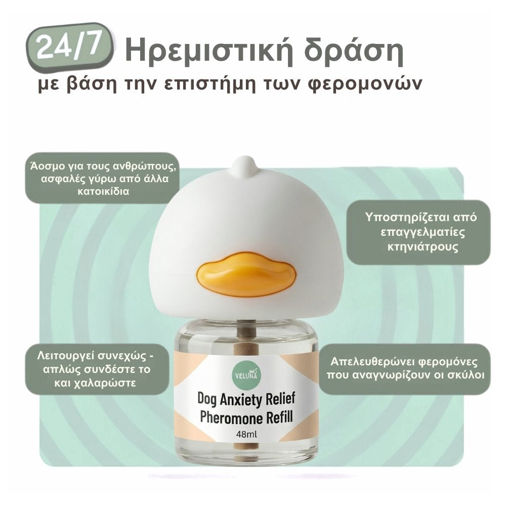 Ο Διαχυτής Φερομονών Σκύλου Veluna χρησιμοποιεί φερομόνες που αναγνωρίζουν οι σκύλοι και αποτελούνται από ενώσεις λιπαρών οξέων. Η φόρμουλα περιλαμβάνει επίσης έναν ουδέτερο διαλύτη που επιτρέπει την ομοιόμορφη διάχυση των φερομονών στον αέρα κατά τη χρήση.